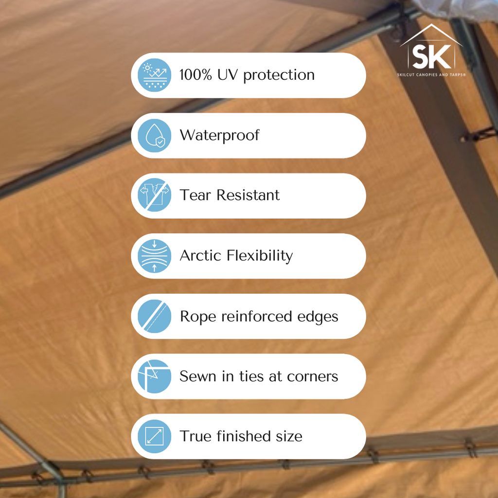 Our Skilcut® Extra Heavy Duty Premium 16 Mil Valance Replacement Canopy Tarp Top Cover with Sewn In Ties are perfect for any covering that utilizes a frame. Long lasting with outstanding protection. Our valances are rugged and very durable. The 16 Mil thickness makes these reliable and strong. We pride ourselves in bringing tarps that should be your first choice for any application, especially in commercial, agricultural or industrial situations where you need supreme durability and strength to handle hard use and tough weather while protecting what you care most about under the shelter.